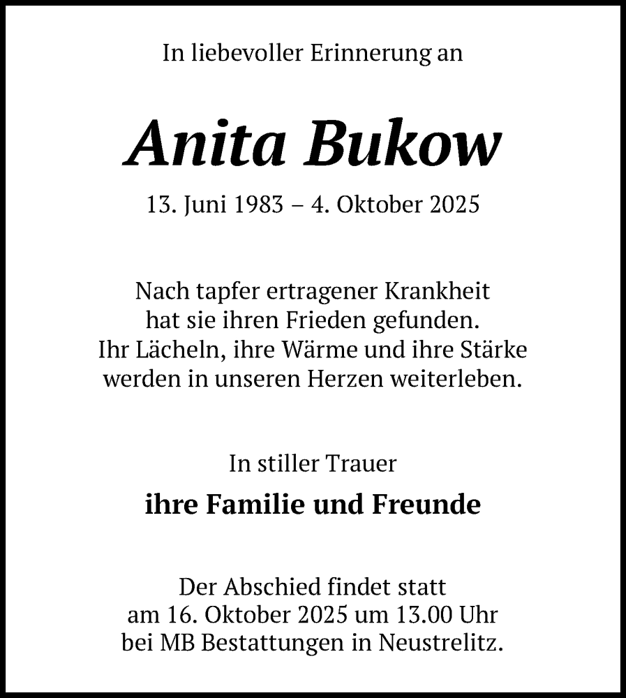 Hier finden Sie alle Traueranzeigen aus der Zeitung, die bisher für Anita Bukow erschienen sind. Weitere Traueranzeigen, die in der Zeitung erscheinen, werden hier ebenfalls aufgelistet